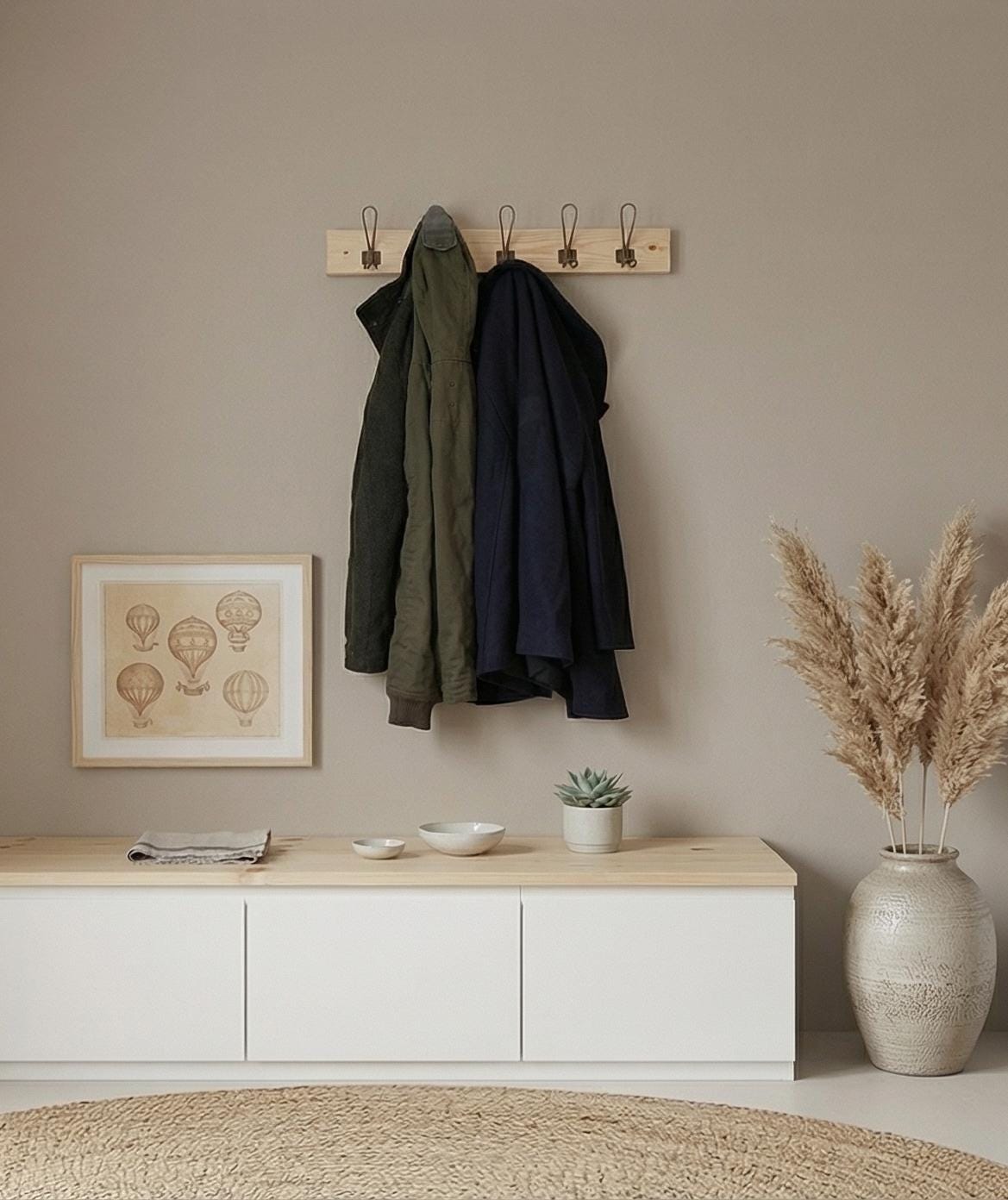 Organise your hallway, entryway, or bedroom with this sturdy wall-mounted coat rack. Featuring double metal hooks for coats, hats, bags, and scarves, it’s practical, space-saving, and easy to install. Rustic design adds character while keeping your home tidy and clutter-free.