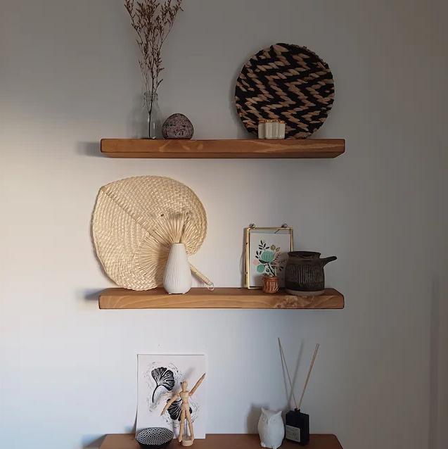 Our wooden floating shelves provide versatile storage for any space, from kitchens to bathrooms, while enhancing your home with eco-friendly craftsmanship. Unlike fixed spice racks, these individual shelves allow for customizable storage and display, turning your spices into art and adding a cosy touch to your kitchen.
